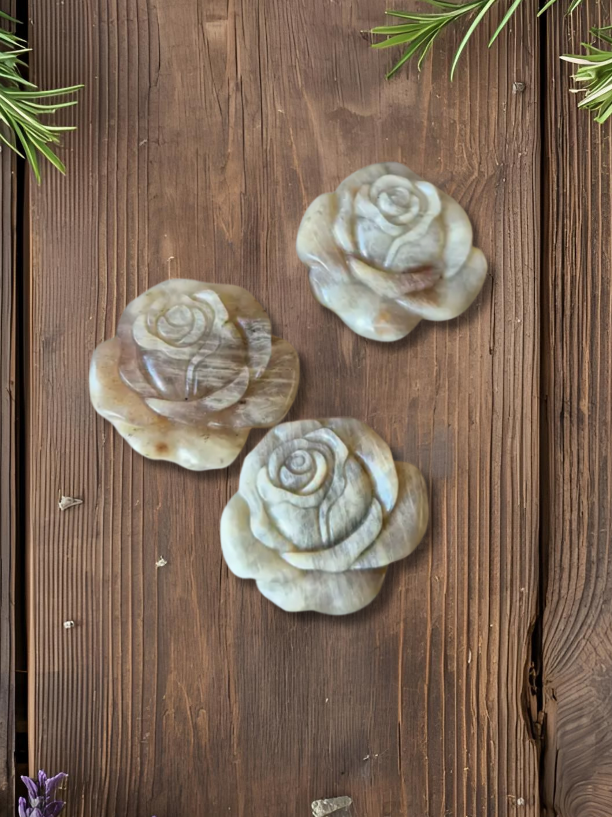 Cette magnifique pierre de lune a été sculptée en forme de rose.