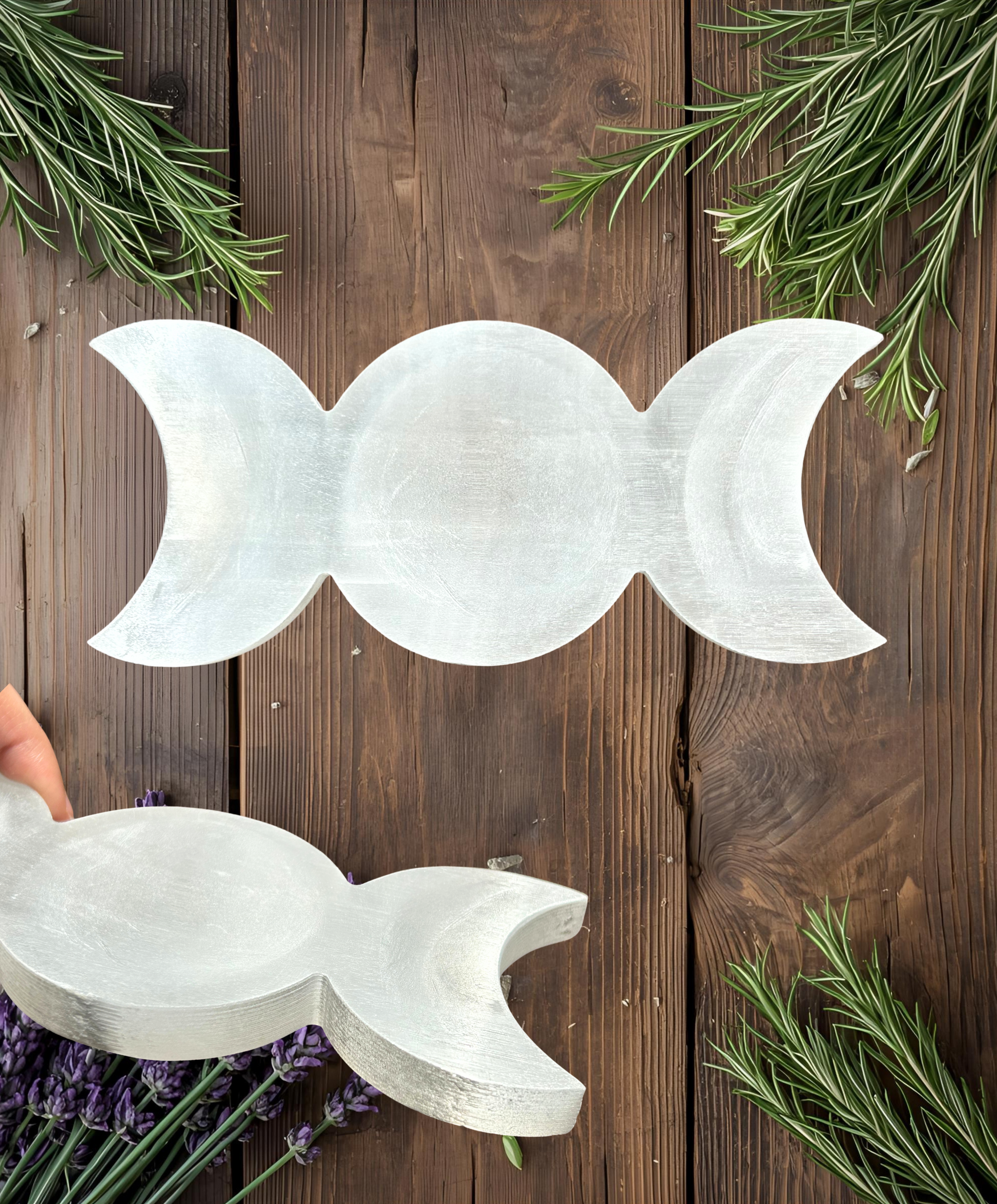 Plateau de chargement Triple Lune en sélénite 16.5 cm. Un bel hommage à l'énergie féminine avec la triple Lune / Hécate et l'énergie douce de cette pierre.