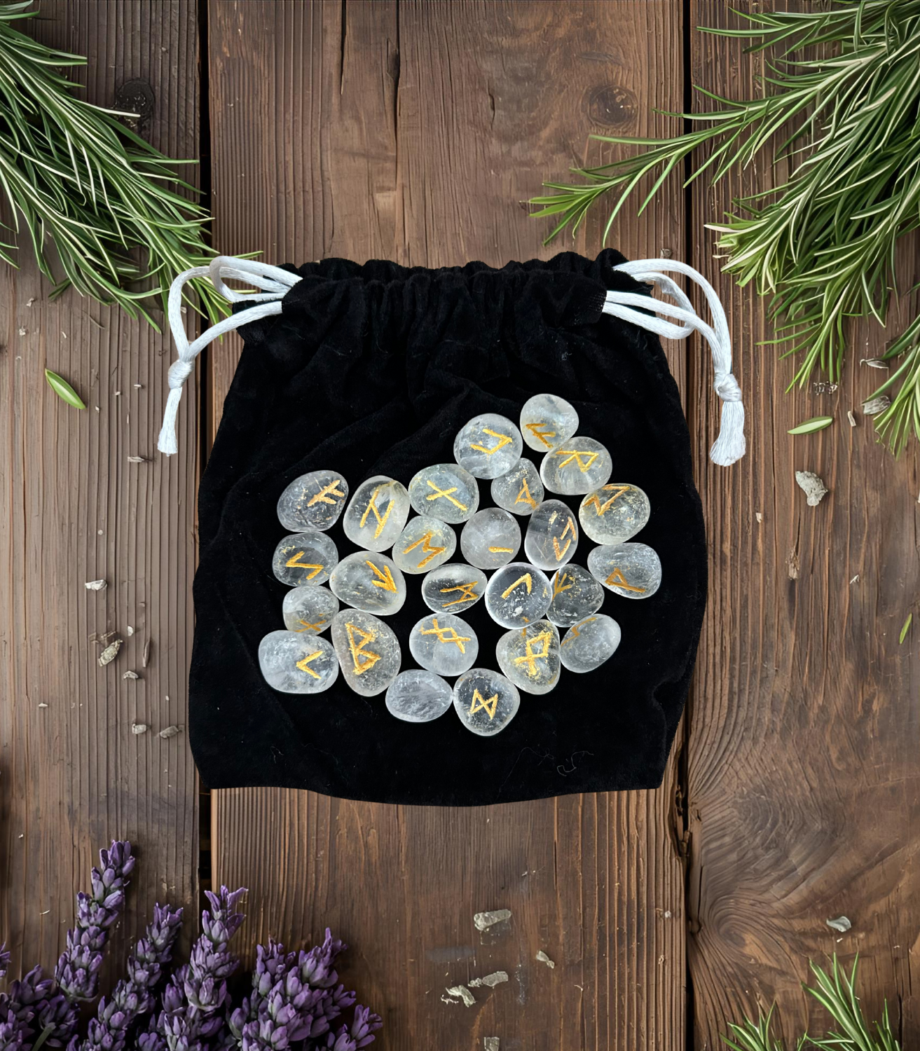 Des runes en cristal de roche renforcent l’intuition, purifient les énergies et servent de canal pour recevoir des messages limpides.